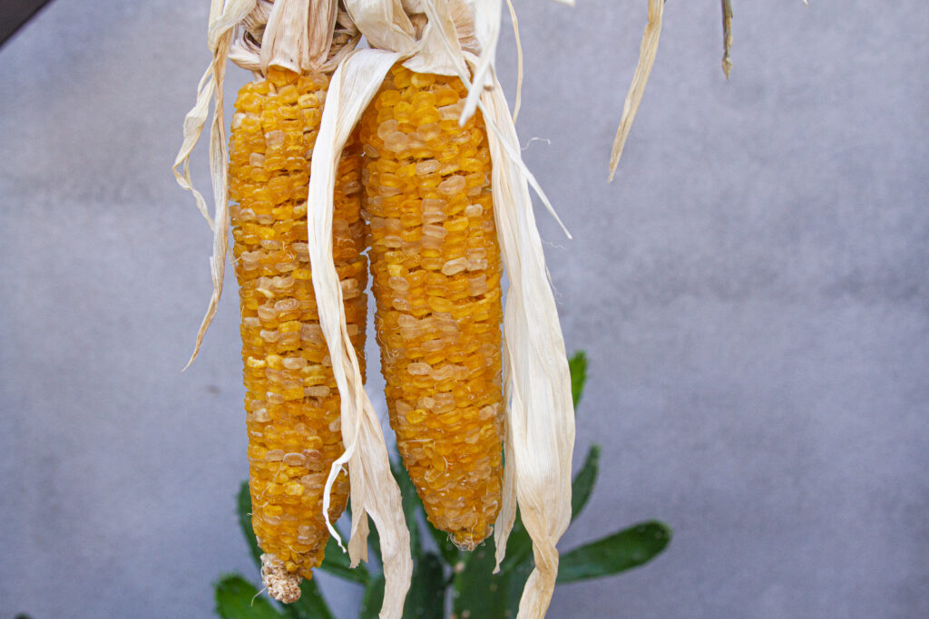 Una vez cocidos, los elotes se cuelgan en tendederos o mecates y se exponen al sol durante al menos una semana, o hasta que los granos se deshidraten completamente. En comunidades con mayor humedad ambiental, las mazorcas se resguardan por la noche o se cubren con mantas para evitar el rocío y las brisas matinales que dificultan el secado. Tras este proceso, los chuales pueden almacenarse colgados en paredes o ganchos hasta el momento de su consumo; entonces se desgranan manualmente y los granos se quiebran en molino de mano o metate.
