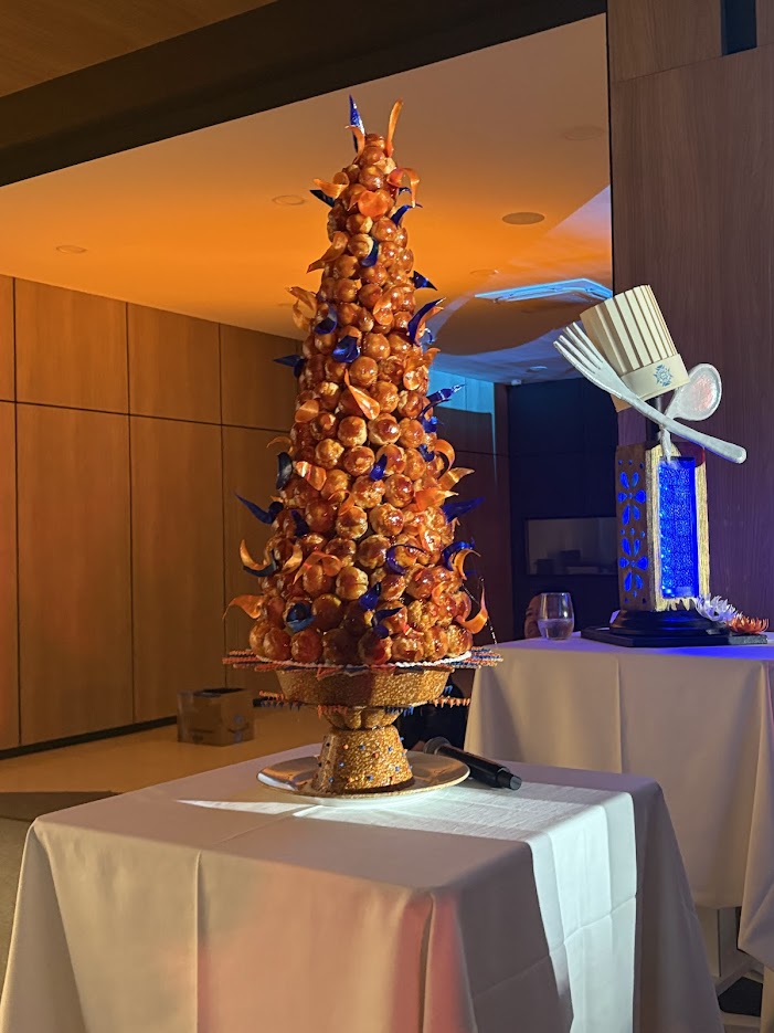 En un festejo de esta dimensión no podía faltar el pastel, y uno de los postres más típicos y populares de Francia, el croquembuche, montaje de profiteroles caramelizados.