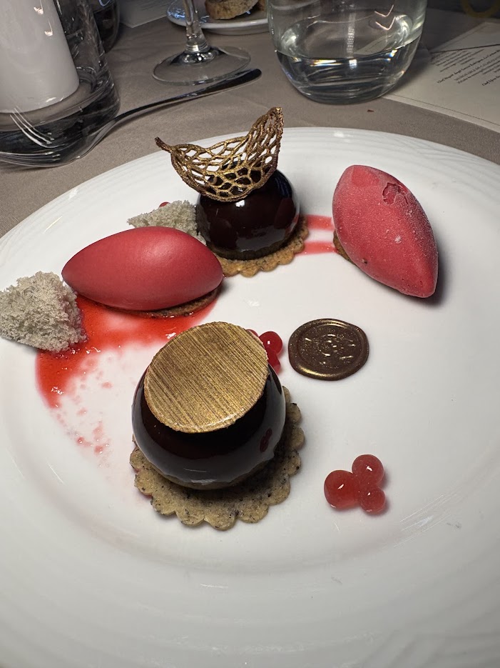 El cierre dulce ofreció dos interpretaciones: una mousse de chocolate al 70% con namelaka de frambuesa, ajonjolí negro y sherbet de frambuesa; y un helado de mantequilla caramelizada acompañado de calabaza criolla, citronela y haba tonka.