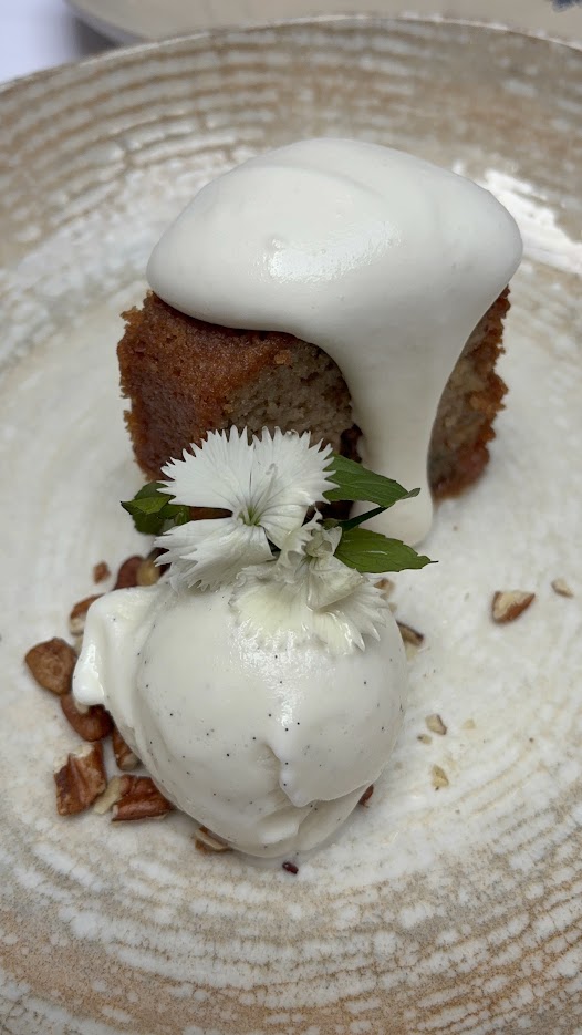 Rosca de nuez enmielada: receta rescatada de un recetario centenario, servida con vino de Jerez, frutas confitadas y helado de vainilla.