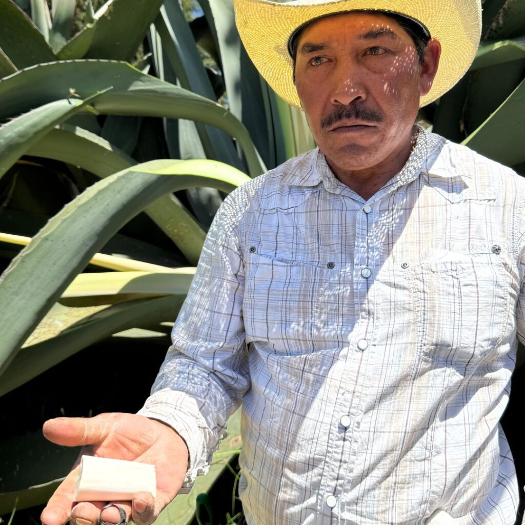 En medio de los magueyales hidalguenses de Singuilucan, en el Rancho La Gaspareña (cfr. Espino & Plascencia, 2025), el maestro tlachiquero Delfino Murcia hace del silencio su mejor instrumento. De piel requemada por los años bajo el intenso sol de Hidalgo y de andar firme y pausado, su sosegada mirada es síntoma de la profundidad de su conocimiento. Murcia sabe que para consumir barbacoa, mixiotes y huevitos hay que esperar una vida. Convivir con la planta para reconocer sus maneras, dialogar con ella como si de un miembro de su familia se tratase (Plascencia, 2025b), y ejecutar procesos de corte o extracción cuyo aprendizaje empírico emula a sus padres, abuelos y ancestros centenarios.