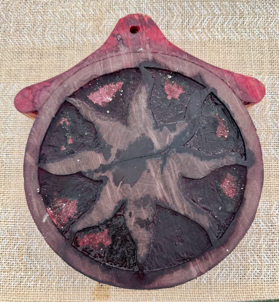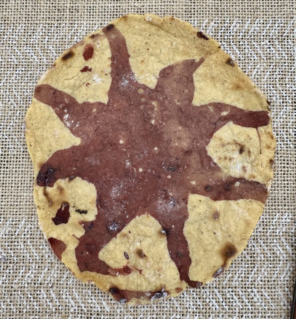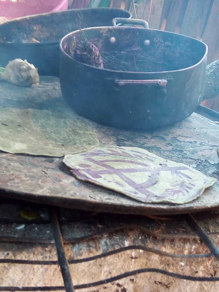 Como herramienta de pintado se utiliza el corazón de la mazorca desgranada y seca, conocida como olote, que se sumerge en un líquido tintado de color morado o violeta. La extracción de esta tintura natural procede del muicle, una planta que está cargada de pigmentos hidrosolubles de matices púrpuras hasta violáceos (Wong et al. 2024) y que desde las sociedades precolombinas es aprovechado para entintar textiles, como parte de la herbolaria tradicional y ceremonias de corte ritual. Los hñahñús hierven las hojas de muicle para luego reposalas durante un día hasta que liberen el colorante que sirve primero para recubrir el sello y luego calcarlo sobre la tortilla recién hecha.