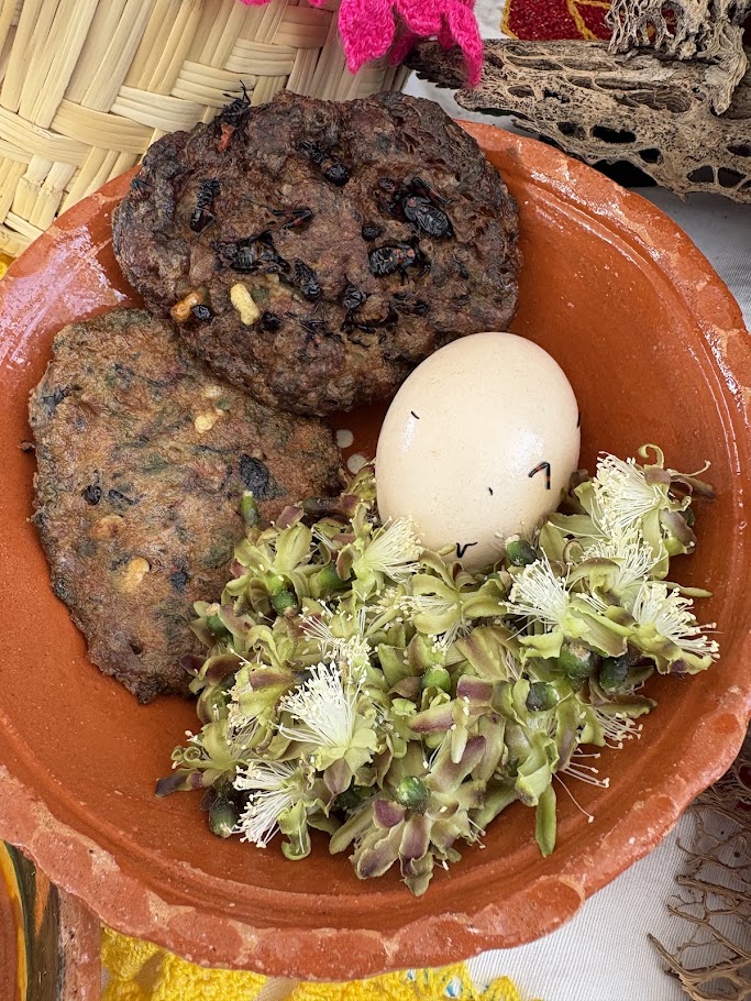 En esta labor participa también su esposo, quien la ayuda a preparar el horno de tierra. “Él buscó las pencas, las lavamos y armó el molde con varas de kiote. En el centro puse una capa de flores de garambullo, chile poblano, los escamoles y un poco de carne de puerco”, relata.